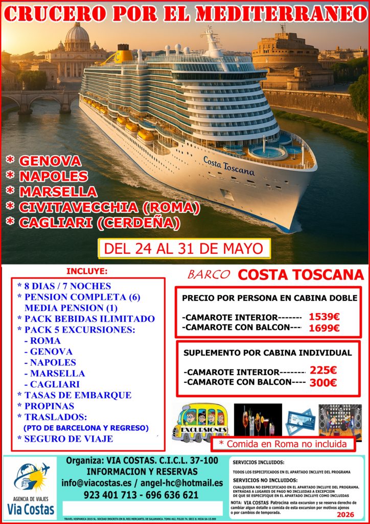 Disfruta de la comodidad del TODO INCLUIDO (única comida no incluida es en Roma), con una atención impecable, espectáculos cada noche, gastronomía exquisita y rincones que invitan al relax mientras navegas por las aguas mas bellas del Mediterráneo.
